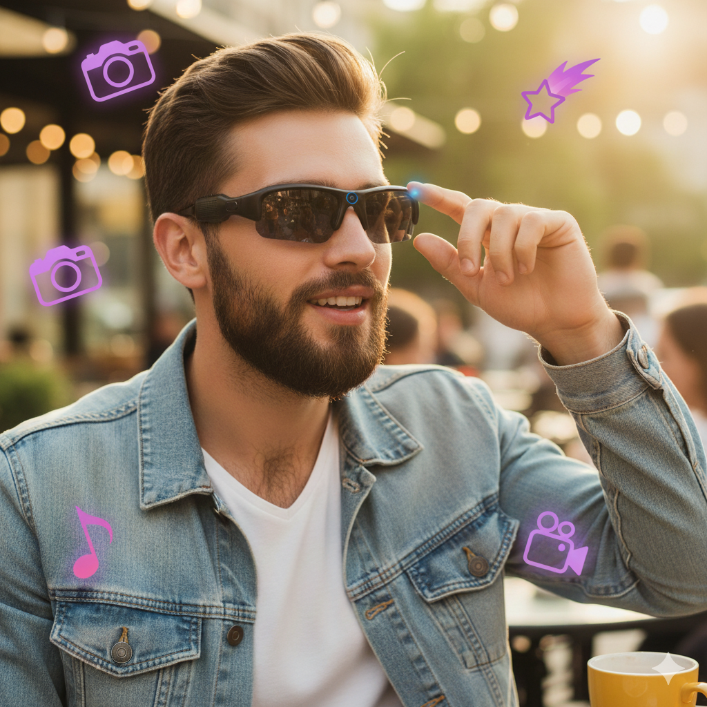 Un objectif est placé à l’avant des lunettes permet de capturer photos et vidéos directement depuis la monture.